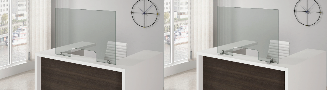 Mampara ANETO: Pantalla de protección frontal, que permite tanto el uso a nivel de la mesa/mostrador, como con apertura inferión para atención al público.