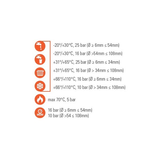 - The maximum pressures and working temperatures are in accordance with EN 1254-1. They are defined considering the joining method of welding of accessories following the ISO 17672 standard.