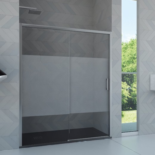 Shower front consisting of a fixed and a sliding door without lower guides.