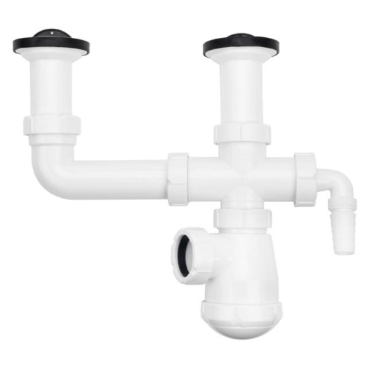 Sifón de botella, salida lateral extensible, con doble válvula Ø70 mm. y toma de electrodomésticos.