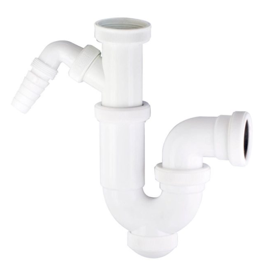 Sifón curvo extensible de salida horizontal con racor (tuerca loca) y toma de electrodomésticos.