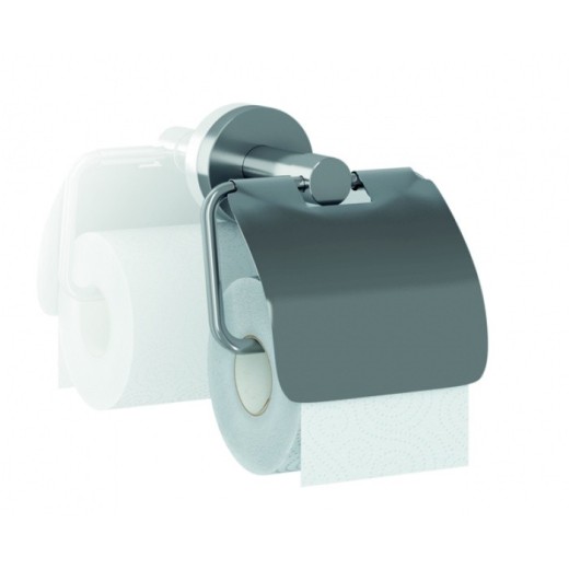 Porta rollos con tapa para papel higienico compuesto de un soporte a pared, un florón cubre soporte, una varilla porta rollos y una tapa cubre rollos.