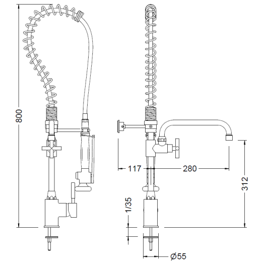 Sistema de muelle:  fabricado en acero inoxidable AISI 304 cromado, regulable en altura con giro de 360º.