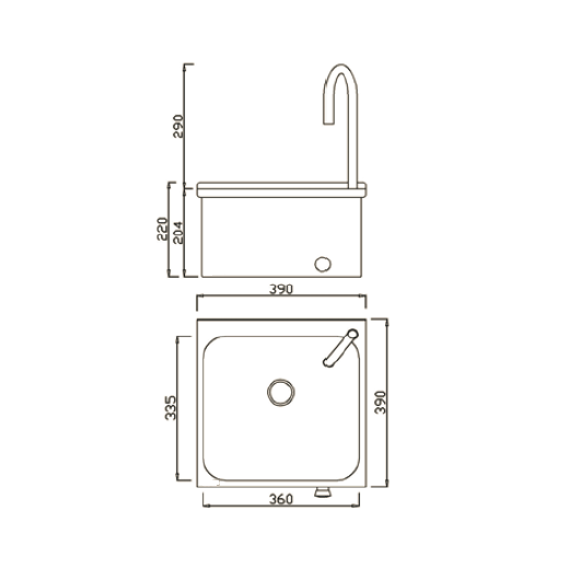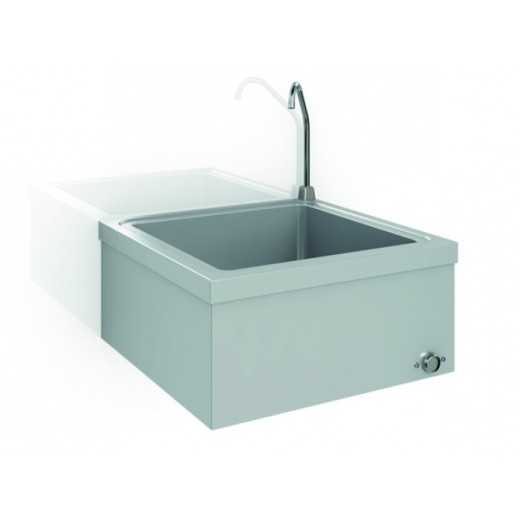 Lavamanos mural activado con rodilla, formado por una base de acero inoxidable y un grifo.