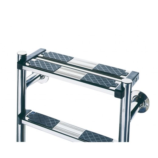 Peldaños y pasamanos con barra de 43 mm. en acero inox AISI-316 pulido brillante.