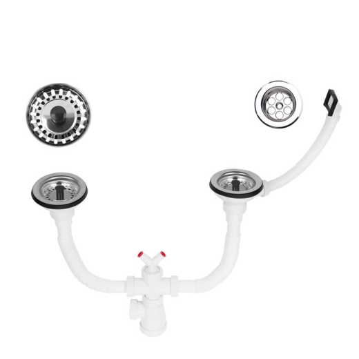 Sifón botella extensible, de salida horizontal con alargaderas flexibles, dos válvulas cestilla de acero inoxidable 115 mm., un rebosadero y toma de electrodomésticos.