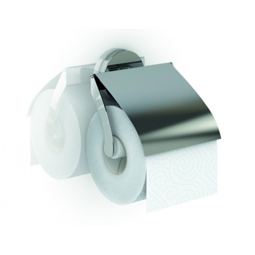 Porta rollos con tapa compuesto de un soporte a pared, un florón cubre soportes y el portarollos.