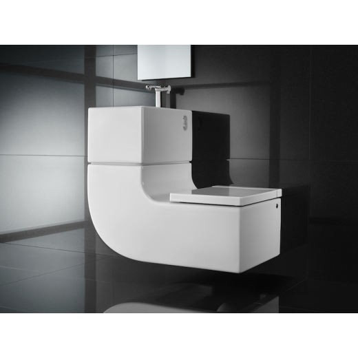 O W + W é uma combinação de lavatório + vaso sanitário de peça única para instalação na parede.