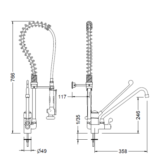 Torneira misturador monocomando: cozinha profissional para uso com bica ou coluna. Corpo em latão CC754S cromado de acordo com a EN 248. Cabo médico em tecnopolímero. Bica giratória inclinada com suporte em cerâmica de ¼ de volta e arejador plástico antical. Equipado com cartucho misturador cerâmico D40, conexões flexíveis e válvulas de retenção. Inclui todos os elementos de fixação.