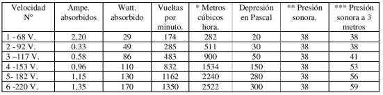 Tabla de características técnicas: