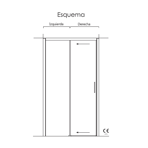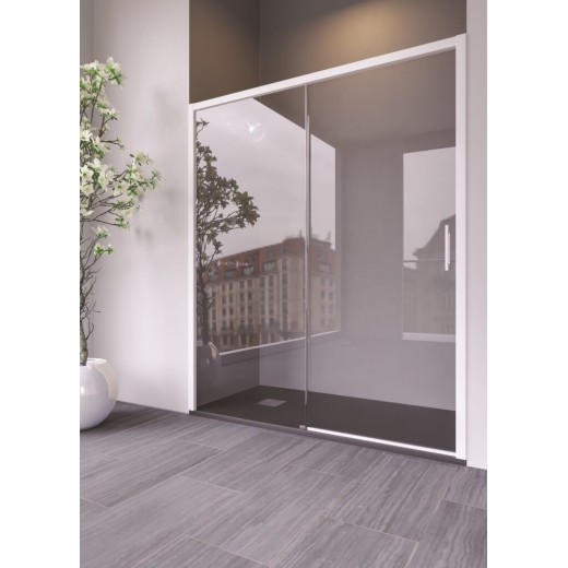 Parte frontal do chuveiro composta por uma porta fixa e uma porta de correr sem guias inferiores.