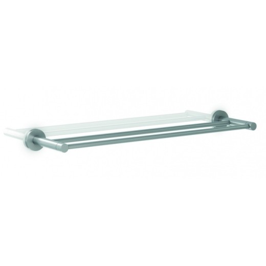 Toallero de barra doble compuesto de dos soportes a pared, dos florones cubre soportes y dos barras para toallas.